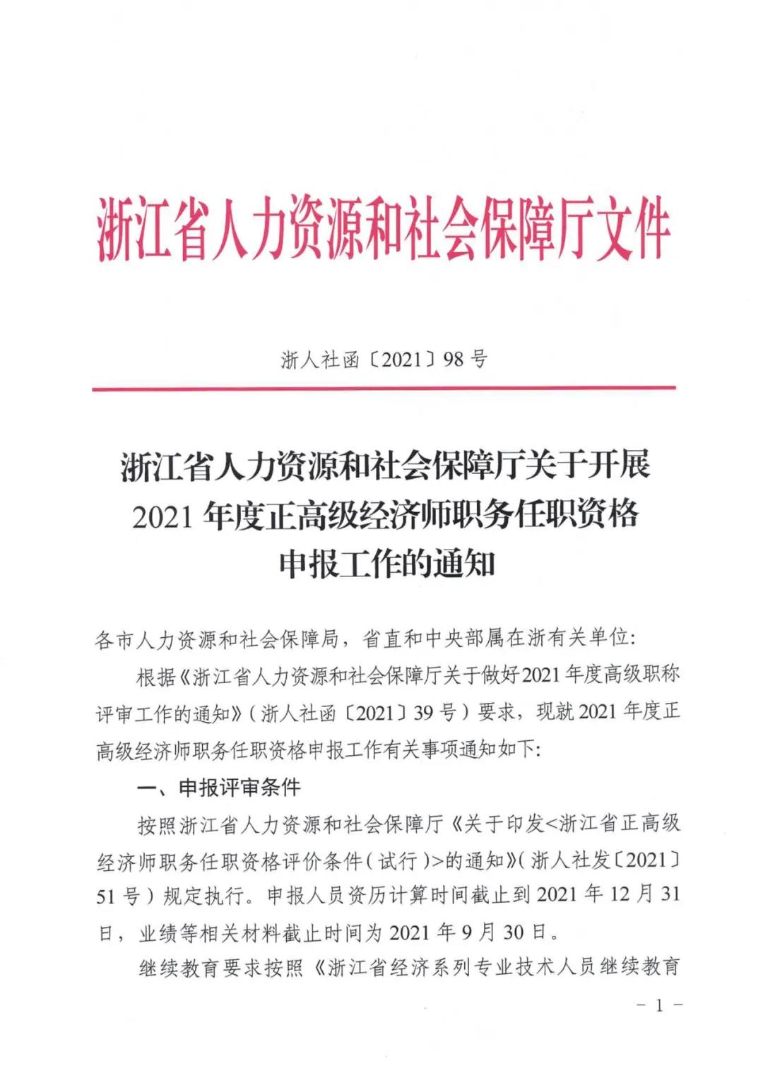 浙江省人力资源和社会保障厅关于开展2021年度正高级经济师职务任职资格申报工作的通知